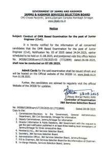 It is hereby notified for the information of all concerned candidates that the OMR Based Examination for the post of Junior Engineer (Civil), Notification No. 03 of 2025 dated 24.04.2025, earlier scheduled to be held on 31.08.2025, and postponed vide this office Notice No. JKSSB/COEOExam/UT/29/2025-03 (7722899) dated: 26-08-2025, shall now be conducted on 07.09.2025.