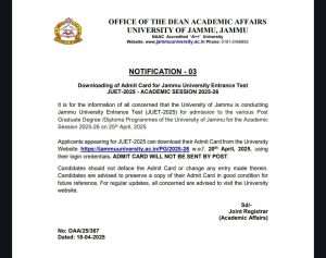 Downloading of Admit Card for Jammu University Entrance Test JUET-2025 – ACADEMIC SESSION 2025-26
