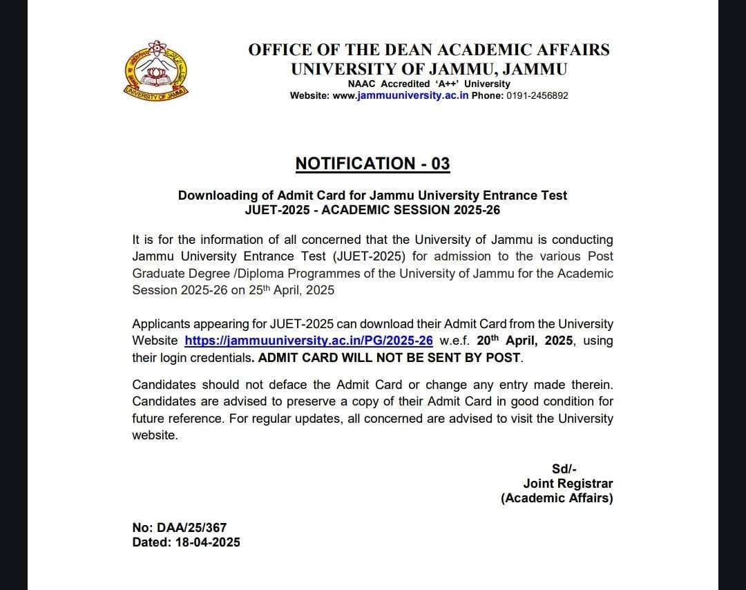 It is for the information of all concerned that the University of Jammu is conducting Jammu University Entrance Test (JUET-2025) for admission to the various Post Graduate Degree /Diploma Programmes of the University of Jammu for the Academic Session 2025-26 on 25th April, 2025