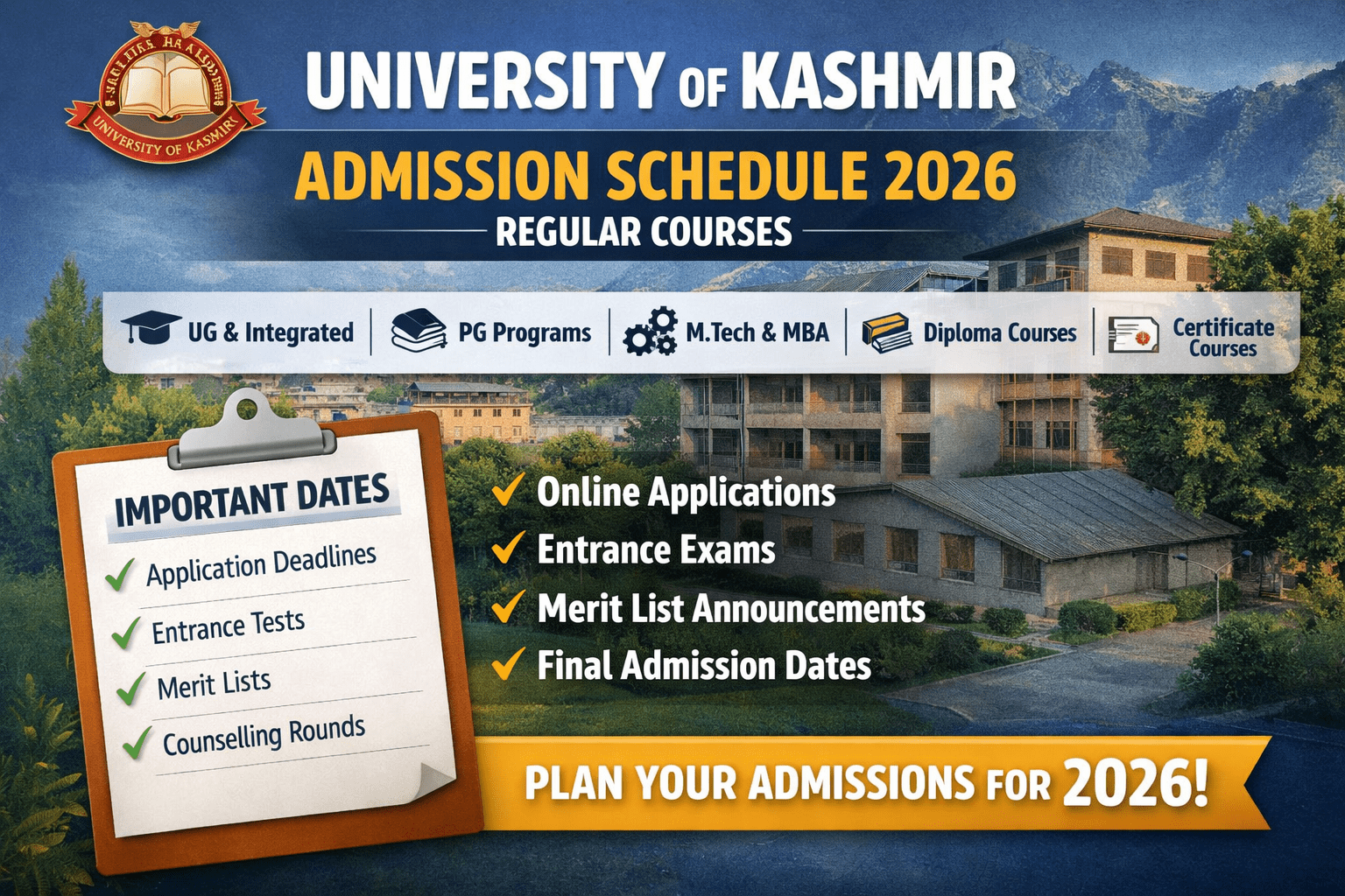 The University of Kashmir has officially announced the Admission Schedule 2026 (Regular Mode) for a wide range of programmes, including UG, PG, Integrated, Diploma, PG Diploma, M.Tech, MBA, and Certificate Courses. The schedule, issued by the Directorate of Admissions & Competitive Examinations, details crucial dates related to online applications, entrance examinations, merit lists, and admission deadlines for the 2026 academic session.