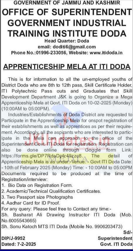 Industries/Establishments of Doda District are requested to Participate in the Apprenticeship Mela for on spot registration of their establishments as well as apprentices as per their requirement. Accordingly, all the aspirants who are interested to participate in the Mela can approach to the office of the Superintendent Govt. ITI Doda for registration. Registration can also be done online through Goggle form Link: https://forms.gle/DP7RdaDpfz49zzc8. The detail of Apprenticeship Mela is as under:-Venue: – Govt ITI Doda Date: – 10th of February 2025 (Monday) Time: – 10:00AM to 05:00PM Documents required to be produced at the time of Registration/interview: