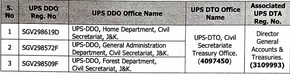 In continuation to the notification issued by this directorate under endorsement no. DGAT/NPS/5/2025/7698685/190 dated 18.06.2025 regarding implementation of Unified Pension Scheme (UPS) for AIS officers in J&K, it is hereby notified that eighty-three (83) AIS officers have submitted their option forms for migration from NPS to UPS. Accordingly, the following UPS-DDOs are designated for processing the migration requests of all such officers who have opted for UPS: