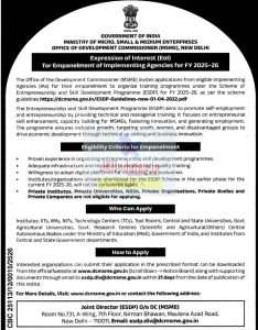 The Office of the Development Commissioner (MSME) invites applications from eligible Implementing Agencies (IAs) for their empanelment to organize training programmes under the Scheme of Entrepreneurship and Skill Development Programme (ESDP) for FY 2025–26, as per the scheme guidelines https://dcmsme.gov.in/ESDP-Guidelines-new-01-04-2022.pdf