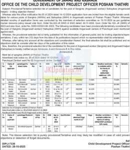 Whereas side this office notification No.05 of 2024 dated 14-12-2024 application form are invited from the eligible female candidates for various posts of Sanginis (AWWs) and Sahayikas (AWH) in Anganwadi centers of Poshan Project Thathri. Whereas detailed scrutiny of application forms was conducted by the members of selection committee on 15-10-2025 as per guideline Human resource policy issued vide Govt. Order No.222-JK SWD of 2022 dated: 30-11-2022, Govt. Order No.103-.JK (SWD) of 2023 and also Govt, order No. SWD-lCDS/4-08- 2023. The following candidates have been provisionally/tentatively considered for the post of Sanginis (Anganwadi worker)/ Sahayikas (AWH) against available Anganwadi centers of Panchayat ward mentioned against each.