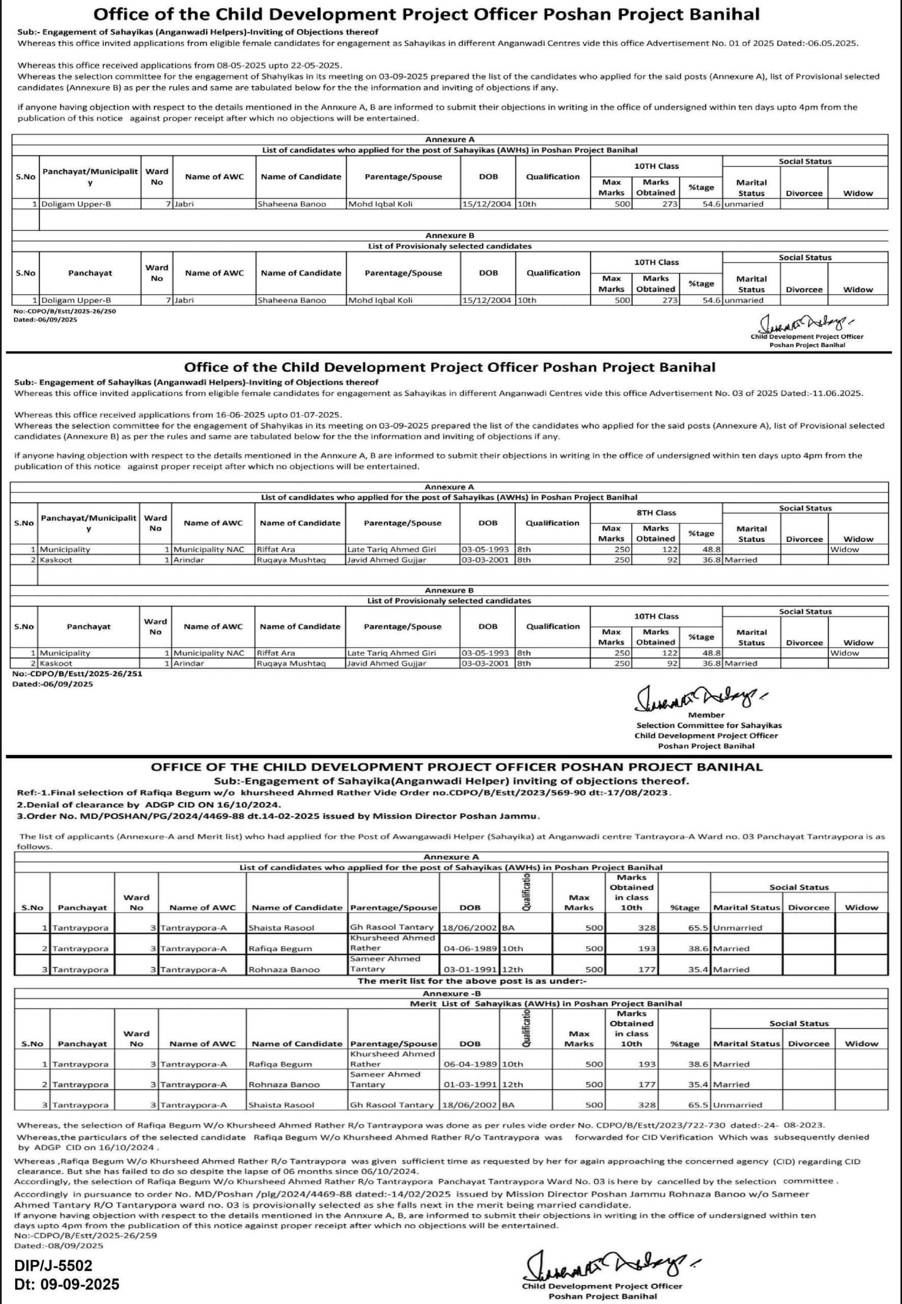 Whereas this office invited applications from eligible female candidates for engagement as Sahayikas in different Anganwadi Centres vide this office Advertisement No. 01 of 2025 Dated: 06.05.2025.