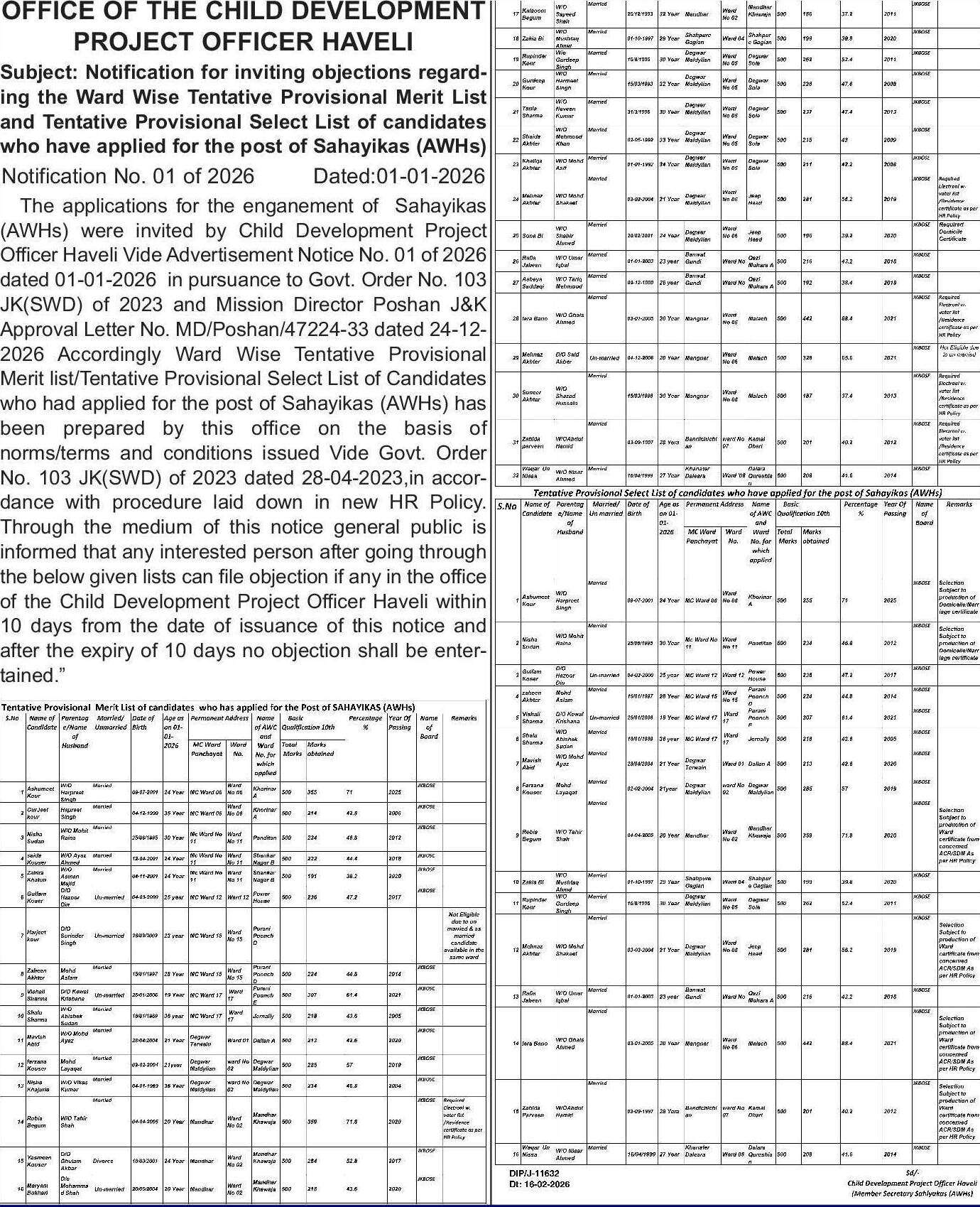 The applications for the enganement of Sahayikas (AWHs) were invited by Child Development Project Officer Haveli Vide Advertisement Notice No. 01 of 2026 dated 01-01-2026 in pursuance to Govt. Order No. 103 JK(SWD) of 2023 and Mission Director Poshan J&K Approval Letter No. MD/Poshan/47224-33 dated 24-12-2026 Accordingly Ward Wise Tentative Provisional Merit list/Tentative Provisional Select List of Candidates who had applied for the post of Sahayikas (AWHs) has been prepared by this office on the basis of norms/terms and conditions issued Vide Govt. Order No. 103 JK(SWD) of 2023 dated 28-04-2023,in accordance with procedure laid down in new HR Policy.