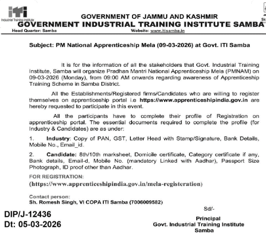 It is for the information of all the stakeholders that Govt. Industrial Training Institute, Samba will organize Pradhan Mantri National Apprenticeship Mela (PMNAM) on 09-03-2026 (Monday), from 09:00 AM onwards regarding awareness of the Apprenticeship Training Scheme in Samba District.