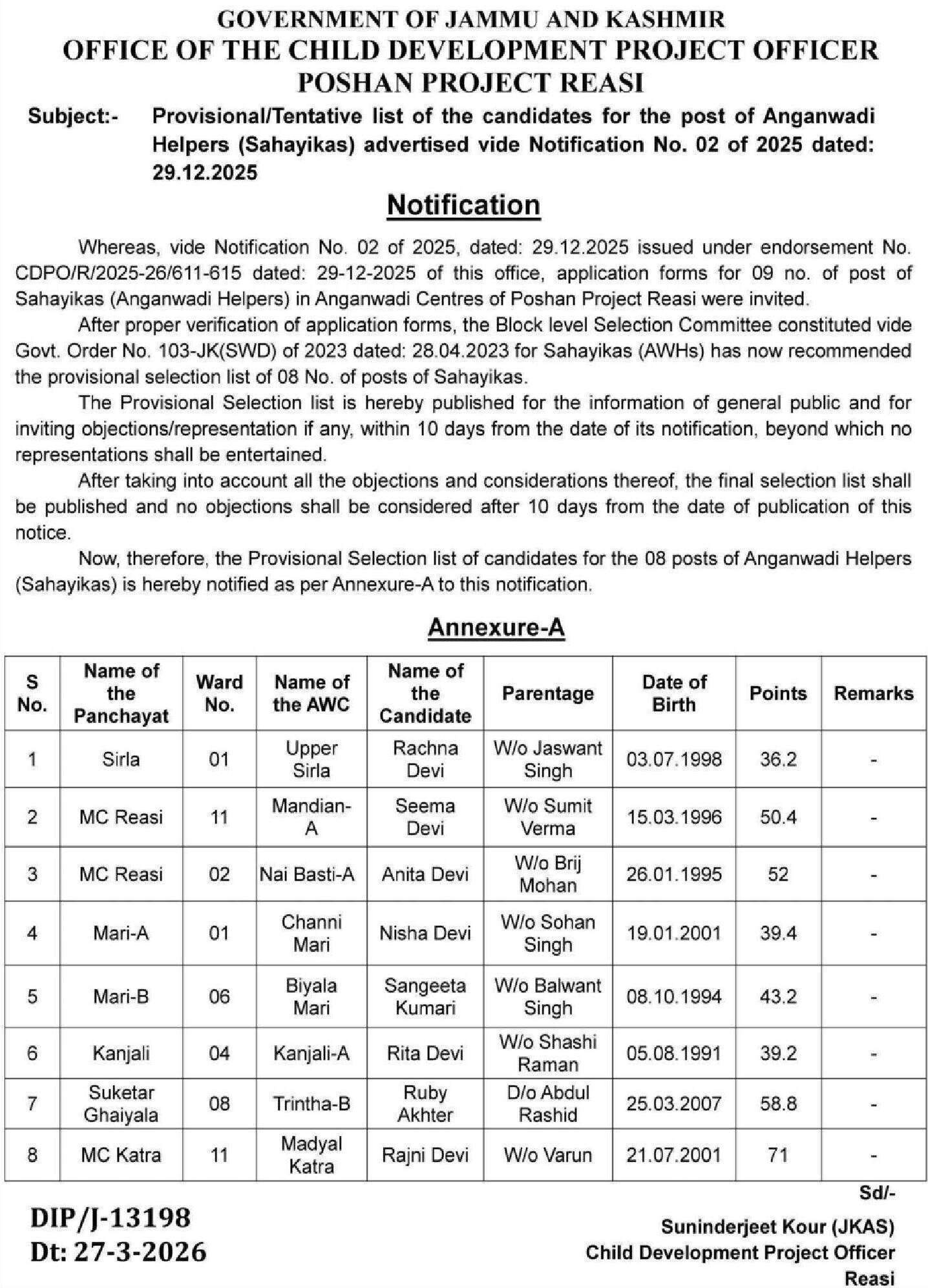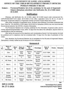 Whereas, vide Notification No. 02 of 2025, dated: 29.12.2025 issued under endorsement No. CDPO/R/2025-26/611-615 dated: 29-12-2025 of this office, application forms for 09 number of posts of Sahayikas (Anganwadi Helpers) in Anganwadi Centres of Poshan Project Reasi were invited.
