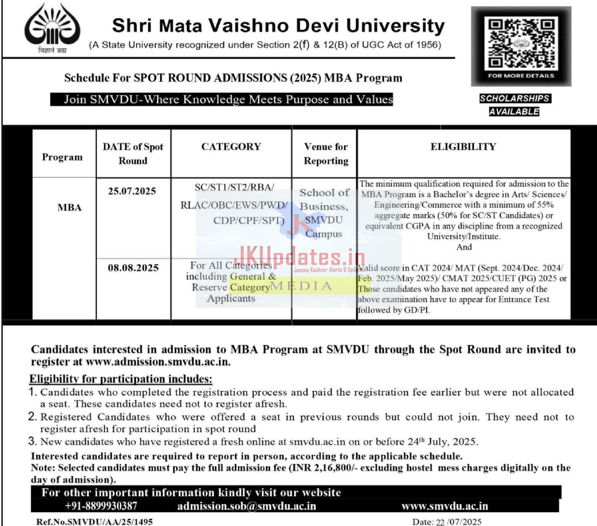 Candidates interested in admission to MBA Program at SMVDU through the Spot Round are invited to register at www.admission.smvdu.ac.in