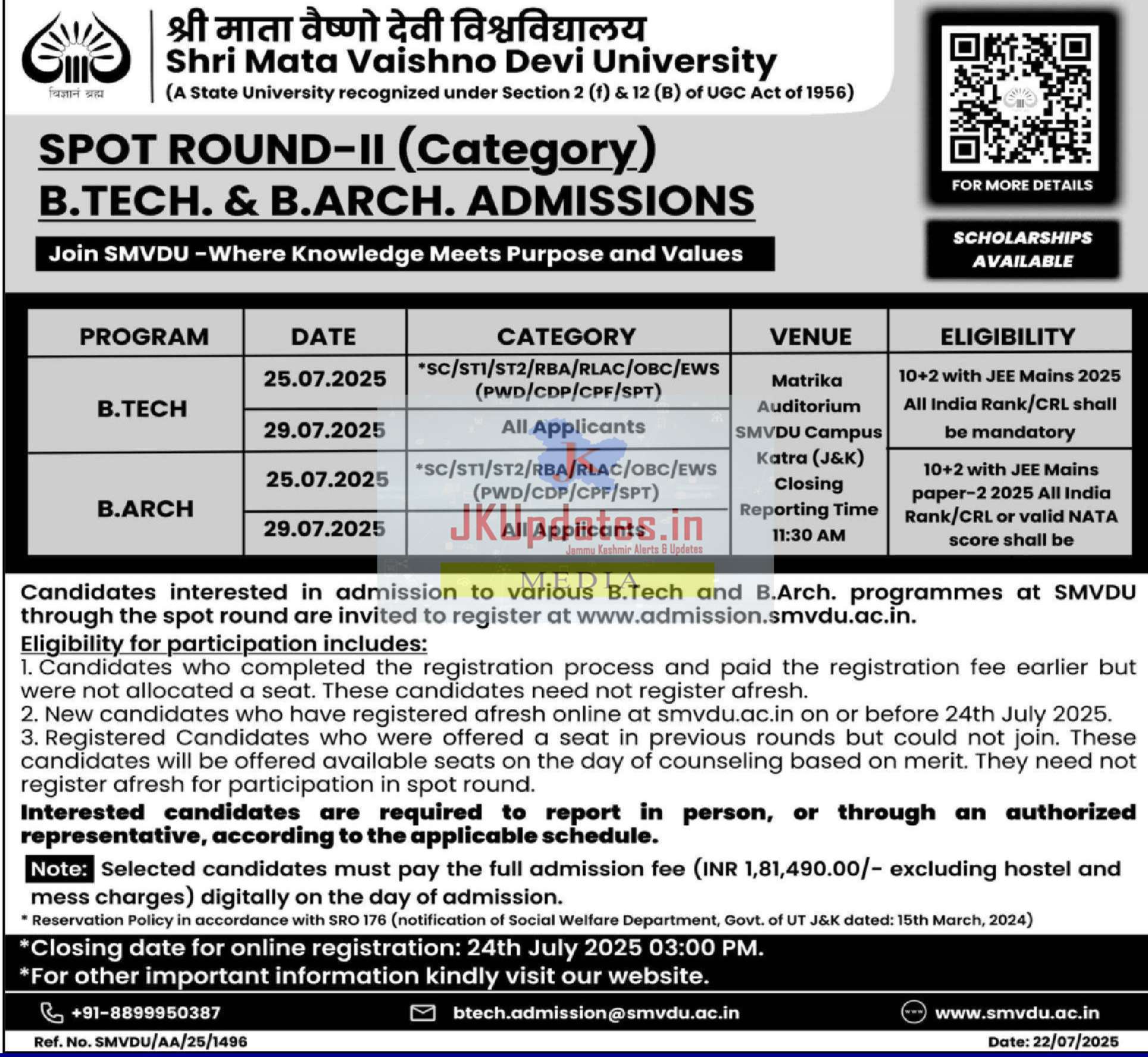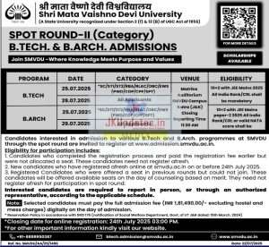 Candidates interested in admission to various B.Tech and B.Arch. programmes at SMVDU through the spot round are invited to register at: www.admission.smvdu.ac.in