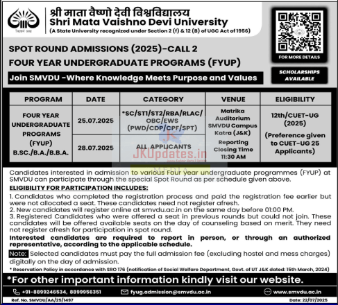 Candidates interested in admission to various Four year undergraduate programmes (FYUP) at SMVDU can participate through the special Spot Round as per schedule given above.