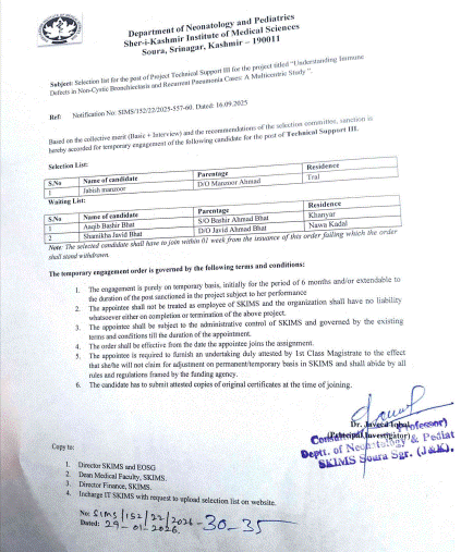 The appointee shall not be treated as an employee of SKIMS and the appointment shall have no liability whatsoever either on completion or termination of the above project.