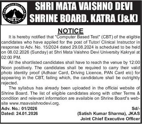 It is hereby notified that “Computer Based Test” (CBT) of the eligible candidates who have applied for the post of Tutor/ Clinical Instructor in response to Adv. No. 15/2024 dated 29.08.2024 is scheduled to be held on 08.02.2026 (Sunday) at Shri Mata Vaishno Devi University Kakryal at 02:00 PM.