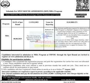 Candidates interested in admission to MBA Program at SMVDU through the Spot Round are invited to register at www.admission.smvdu.ac.in.
