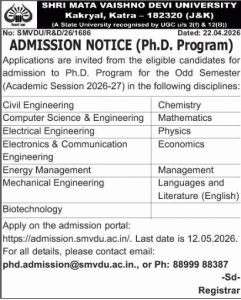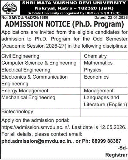 Applications are invited from eligible candidates for admission to the Ph.D. Program for the Odd Semester (Academic Session 2026–27) in the following disciplines: