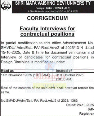 In partial modification to this office Advertisement No. SMVDU/ Adm/Estt.-FA/ Rect.Adv/2 of 2025/1314 dated 15-10-2025, Date & Time for document verification and Interview of candidates for contractual positions in Design Discipline is modified as under: