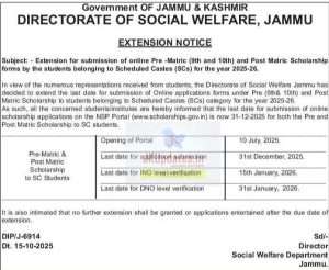 In view of the numerous representations received from students, the Directorate of Social Welfare Jammu has decided to extend the last date for submission of Online applications forms under Pre (9th& 10th) and Post Matric Scholarship to students belonging to Scheduled Castes (SCs) category for the year 2025-26.