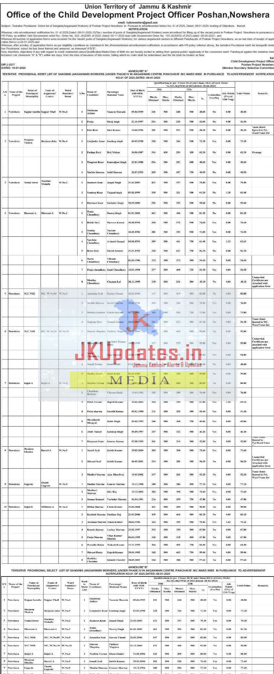 Tentative Provisional Select list of Sanginis(Anganwadi Workers) of Poshan Project Nowshera in Pursuant to advertisement Notice No. 01 of 2025, Dated:-08-01-2025- inviting of Objections thereof.