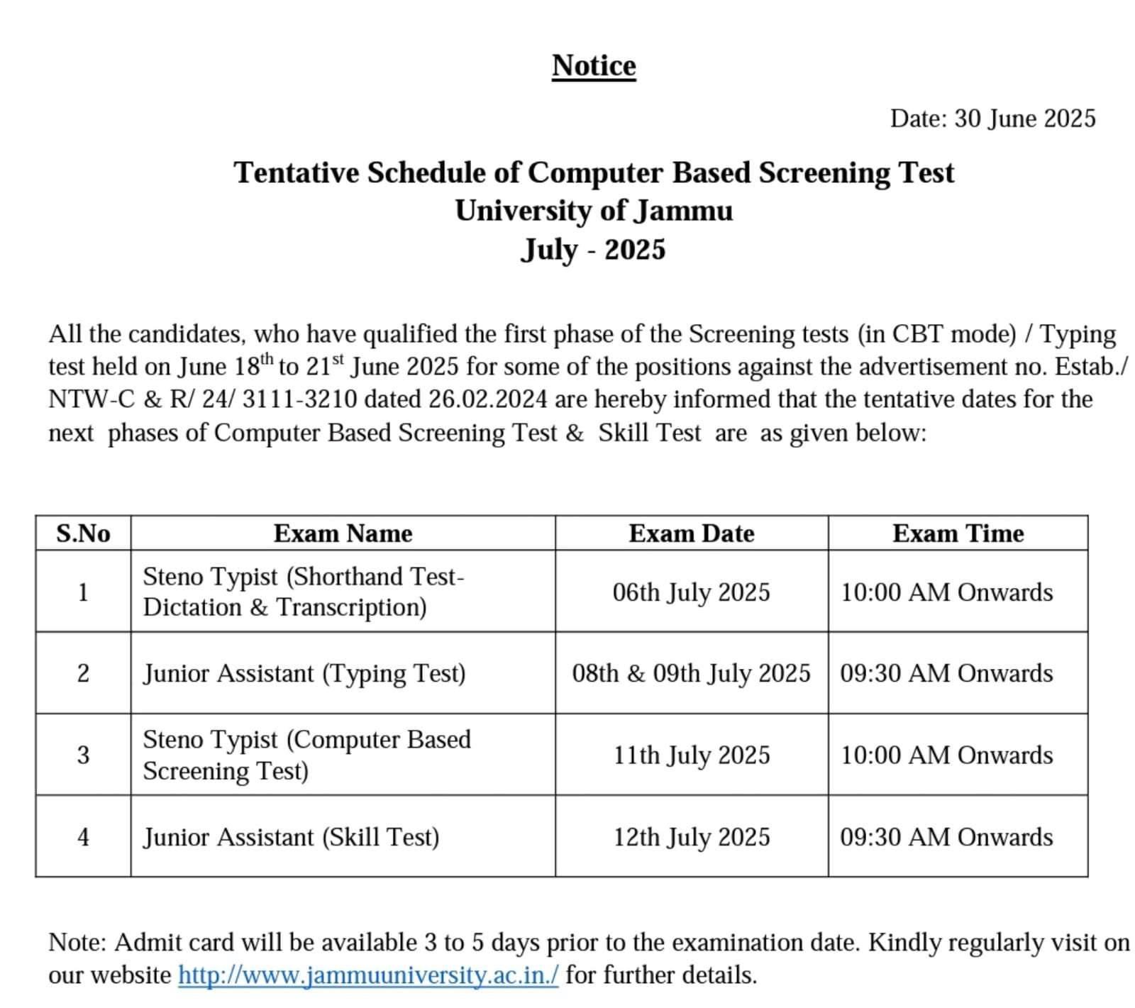 | 2 | Junior Assistant (Typing Test) | 08th & 09th July 2025 | 09:30 AM Onwards |