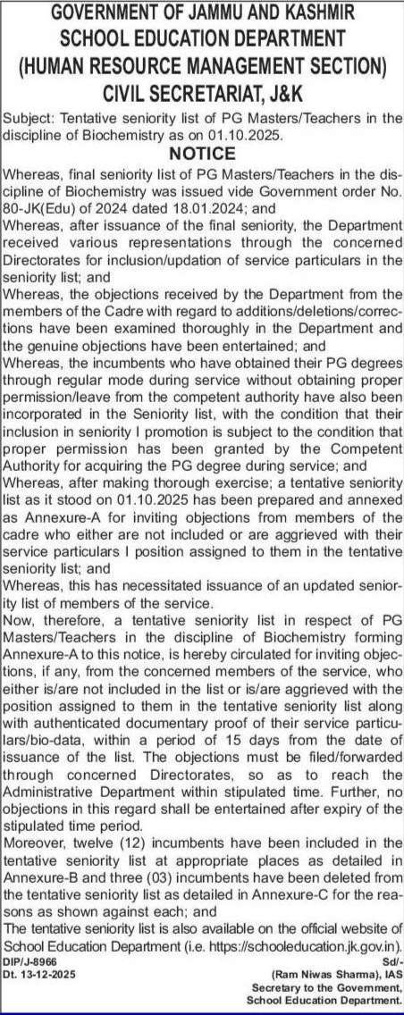 Now, therefore, a tentative seniority list in respect of PG Masters/Teachers in the discipline of Biochemistry forming Annexure-A to this notice, is hereby circulated for inviting objections, if any, from the concerned members of the service, who either is/are not included in the list or is/are aggrieved with the position assigned to them in the tentative seniority list along with authenticated documentary proof of their service particulars/bio-data, within a period of 15 days from the date of issuance of the list. The objections must be filed/forwarded through concerned Directorates, so as to reach the Administrative Department within stipulated time. Further, no objections in this regard shall be entertained after expiry of the stipulated time period.