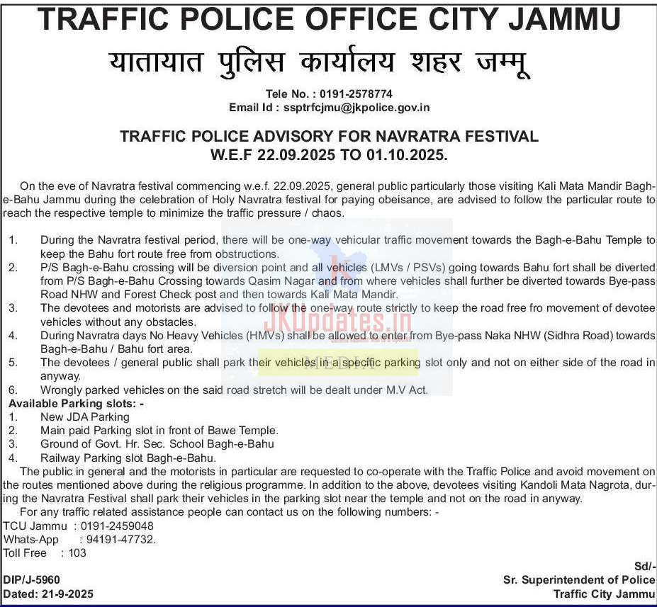 On the eve of Navratra festival commencing w.e.f. 22.09.2025, general public particularly those visiting Kali Mata Mandir Bagh-e-Bahu Jammu during the celebration of Holy Navratra festival for paying obeisance, are advised to follow the particular route to reach the respective temple to minimize the traffic pressure / chaos.