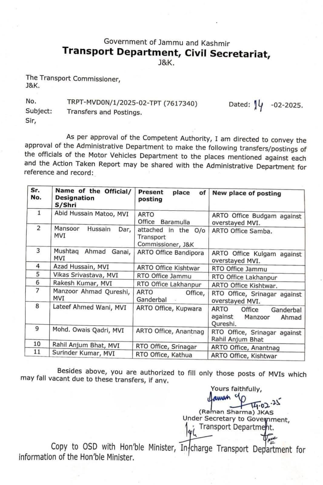 As per approval of the Competent Authority, I am directed to convey the approval of the Administrative Department to make the following transfers/postings of the officials of the Motor Vehicles Department to the places mentioned against each and the Action Taken Report may be shared with the Administrative Department for reference and record :