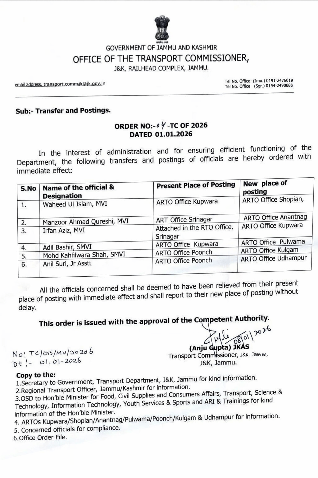 Transport Comm J&K Vishesh Mahajan ordered transfers and postings.