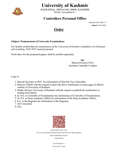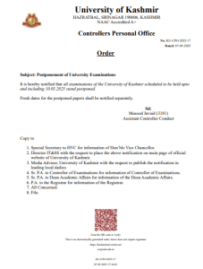 It is hereby notified that all examinations of the University of Kashmir scheduled to be held upto and including 10.05.2025 stand postponed.