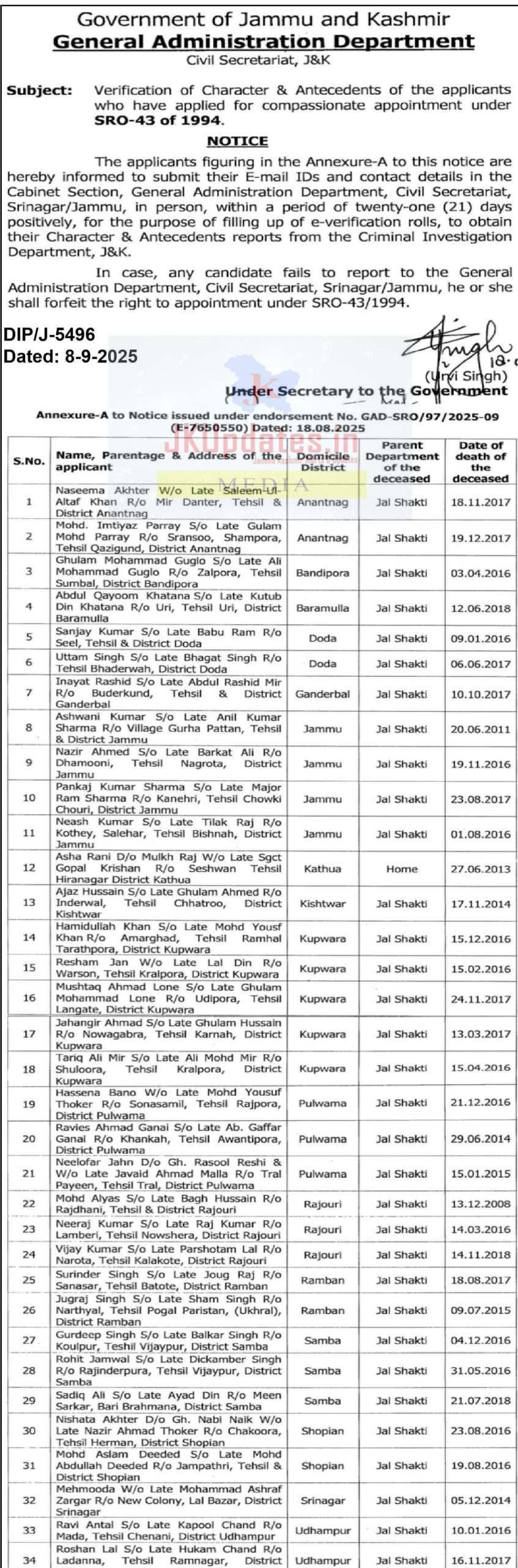 The applicants figuring in the Annexure-A to this notice are hereby informed to submit their E-mail IDs and contact details in the Cabinet Section, General Administration Department, Civil Secretariat, Srinagar/Jammu, in person, within a period of twenty-one (21) days positively, for the purpose of filling up of e-verification rolls, to obtain their Character & Antecedents reports from the Criminal Investigation Department, J&K.
