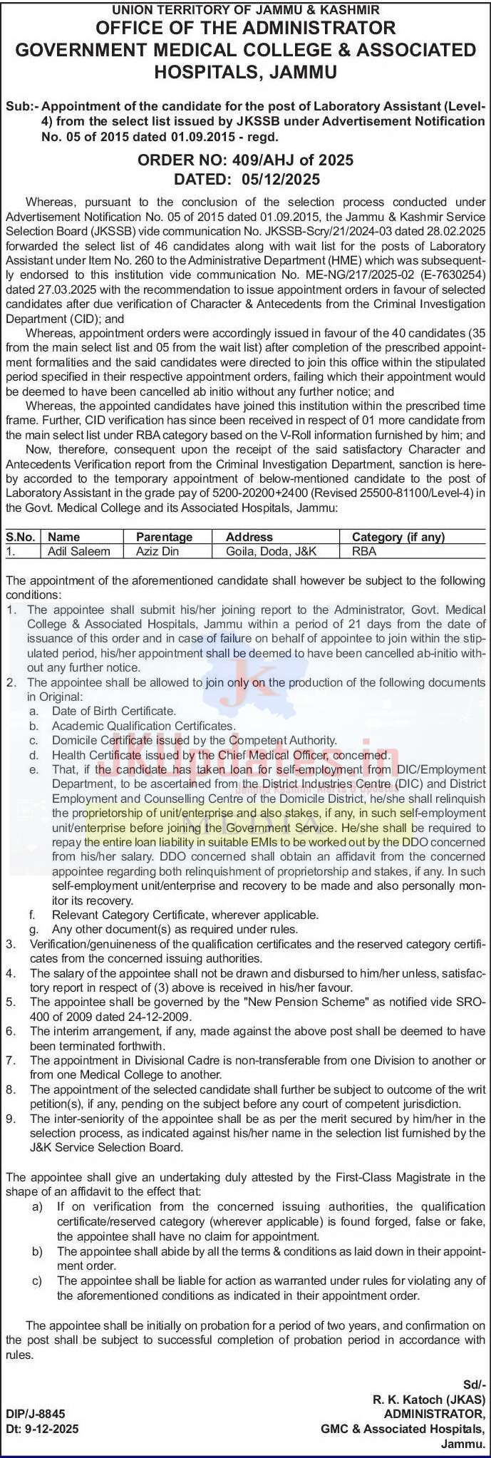 Whereas, pursuant to the conclusion of the selection process conducted under Advertisement Notification No. 05 of 2015 dated 01.09.2015, the Jammu & Kashmir Service Selection Board (JKSSB) vide communication No. JKSSB-Scry/21/2024-03 dated 28.02.2025 forwarded the select list of 46 candidates along with wait list for the posts of Laboratory Assistant under Item No. 260 to the Administrative Department (HME) which was subsequently endorsed to this institution vide communication No. ME-NG/217/2025-02 (E-7630254) dated 27.03.2025 with the recommendation to issue appointment orders in favour of selected candidates after due verification of Character & Antecedents from the Criminal Investigation Department (CID); and