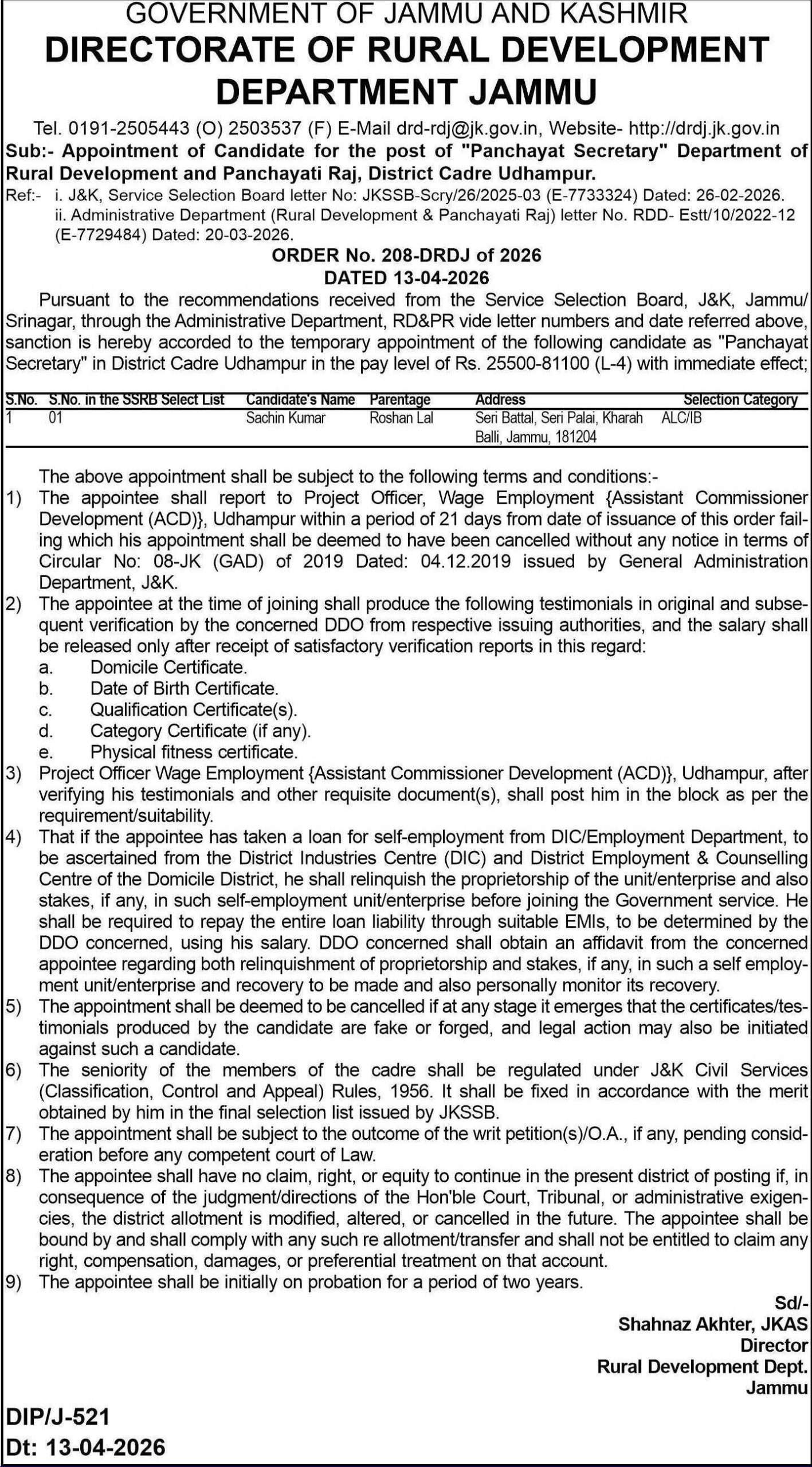 Pursuant to the recommendations received from the Service Selection Board, J&K, Jammu/Srinagar, through the Administrative Department, RD&PR vide letter numbers and dates referred above, sanction is hereby accorded to the temporary appointment of the following candidate as Panchayat Secretary in District Cadre Udhampur in the pay level of Rs. 25,500–81,100 (L-4) with immediate effect: