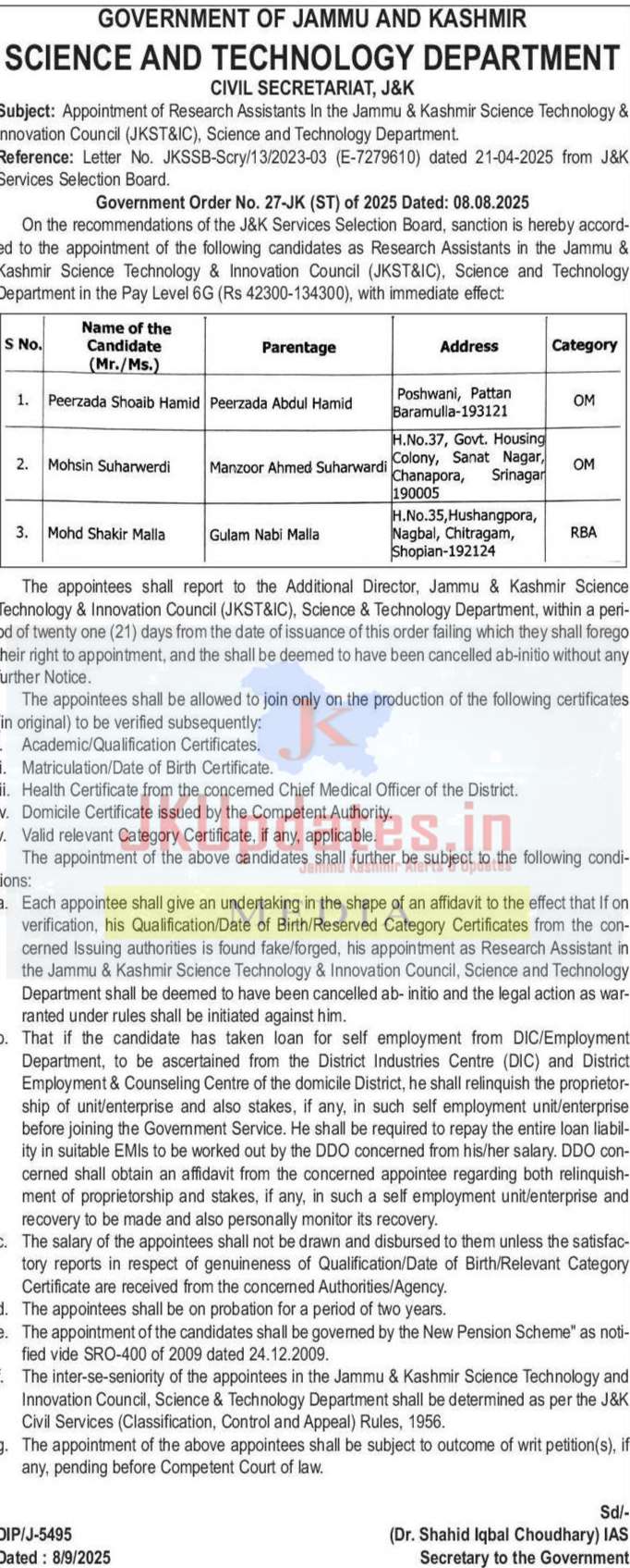 On the recommendations of the J&K Services Selection Board, sanction is hereby accorded to the appointment of the following candidates as Research Assistants in the Jammu & Kashmir Science Technology & Innovation Council (JKST&IC), Science and Technology Department in the Pay Level 6G (Rs 42300-134300), with immediate effect: