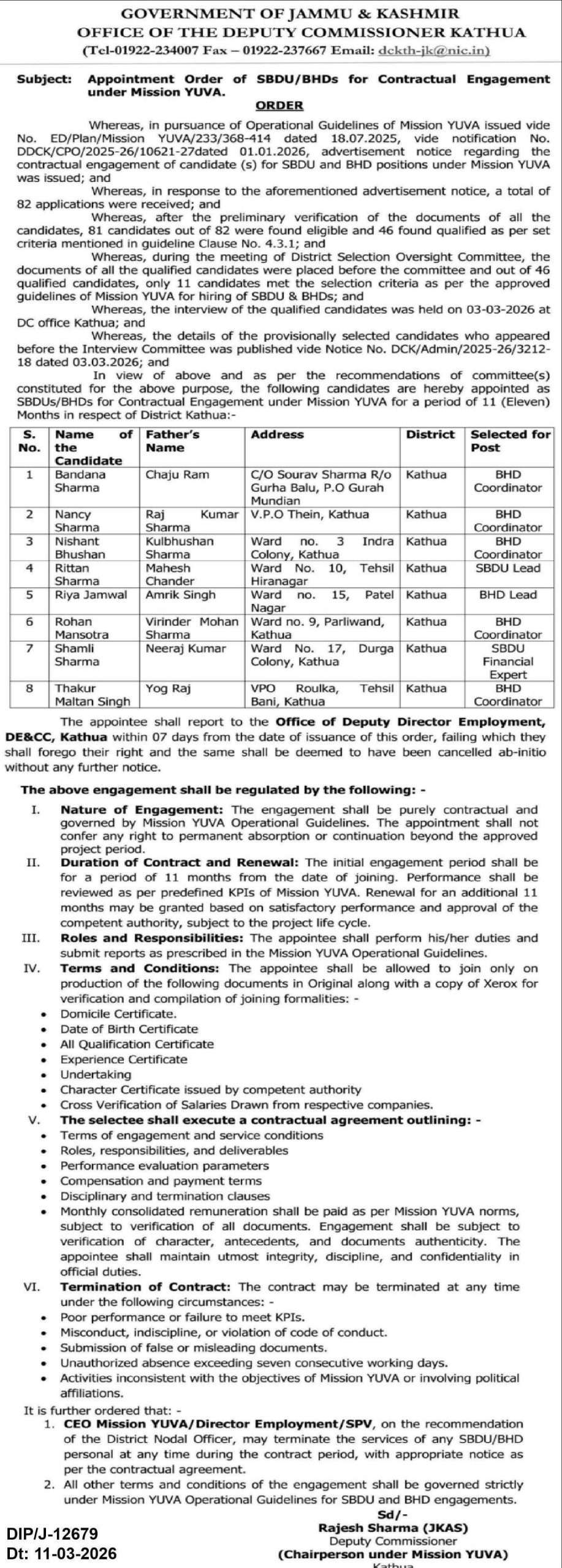 In view of above and as per the recommendations of committee(s) constituted for the above purpose, the following candidates are hereby appointed as SBDUs/BHDs for Contractual Engagement under Mission YUVA for a period of 11 (Eleven) Months in respect of District Kathua: