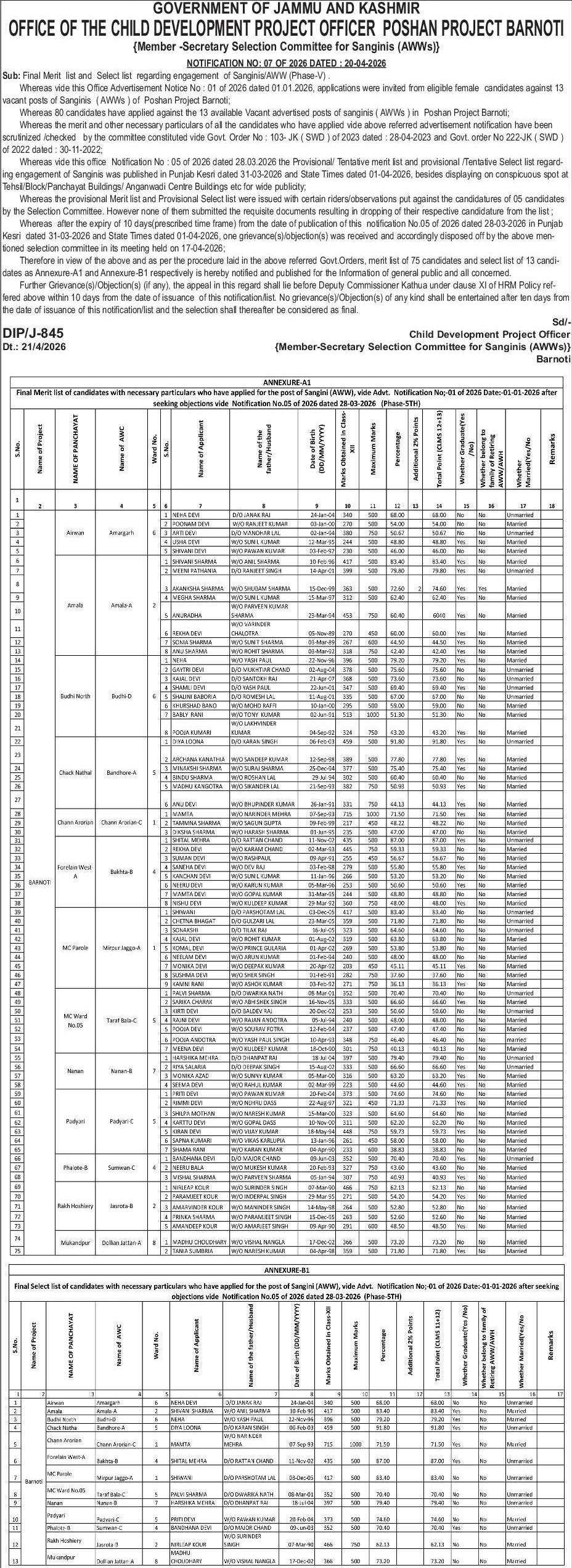 Whereas vide this office Notification No : 05 of 2026 dated 28.03.2026 the Provisional/ Tentative merit list and provisional /Tentative Select list regarding engagement of Sanginis was published in Punjab Kesri dated 31-03-2026 and State Times dated 01-04-2026, besides displaying on conspicuous spot at Tehsil/Block/Panchayat Buildings/ Anganwadi Centre Buildings etc for wide publicity;