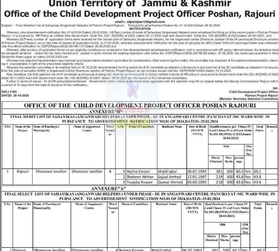 Whereas the selection committee in its meeting held on 07.10.2025 recommended the final select list of 01 candidate as detailed in Annexure-A and merit list of the 03 candidates as detailed in Annexure-B for the post of sahayika (AWH) in Anganwadi Centre Dhanoure Jarallan of Poshan Project Rajouri as per minutes issued vide No. CDPO/R/901/2025 Dated:-10.10.2025.