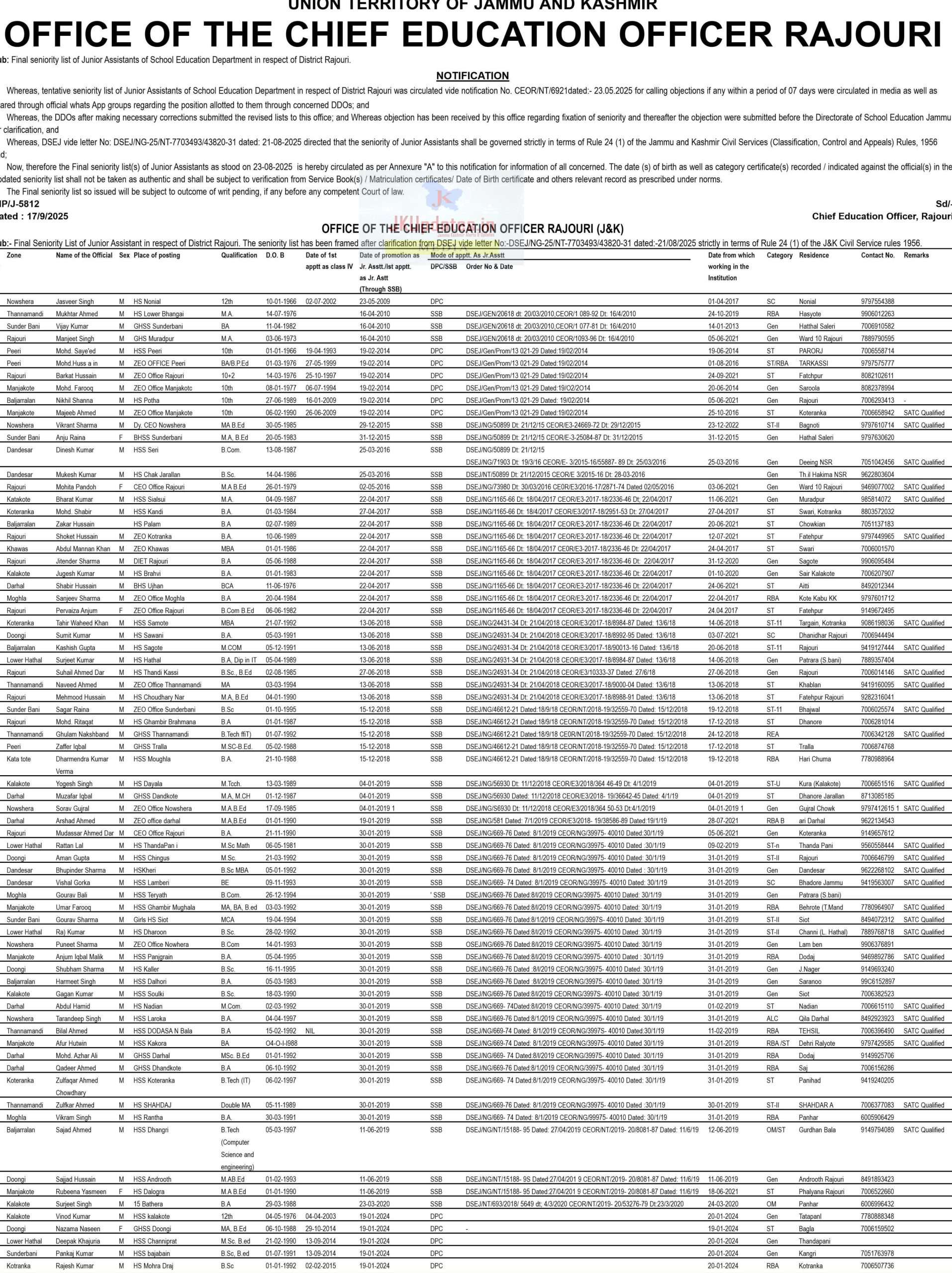 Whereas, tentative seniority list of Junior Assistants of School Education Department in respect of District Rajouri was circulated vide notification No. CEO/RT/6921-1248 dated: 23.06.2025 for calling objections (if any) within a period of 07 days were circulated in media as well as shared through official WhatsApp groups regarding the position allotted to them through concerned DDOs; and