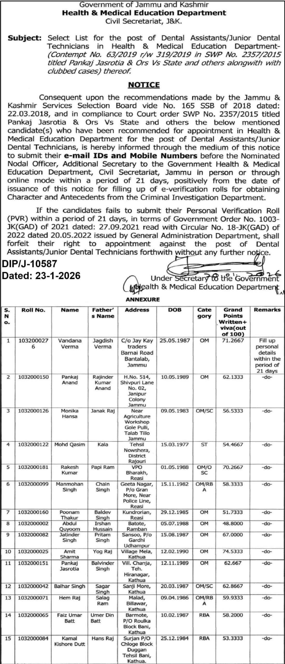 Consequent upon the recommendations made by the Jammu & Kashmir Services Selection Board vide No. 165 SSB of 2018 dated: 22.03.2018, and in compliance to Court order SWP No. 2357/2015 titled Pankaj Jasrotia & Ors Vs State and others, the below mentioned candidate(s) who have been recommended for appointment in Health & Medical Education Department for the post of Dental Assistants/Junior Dental Technicians, is hereby informed through the medium of this notice to submit their e-mail IDs and Mobile Numbers before the Nominated Nodal Officer, Additional Secretary to the Government Health & Medical Education Department, Civil Secretariat, Jammu in person or through online mode within a period of 21 days, positively from the date of issuance of this notice for filling up of e-verification rolls for obtaining Character and Antecedents from the Criminal Investigation Department.