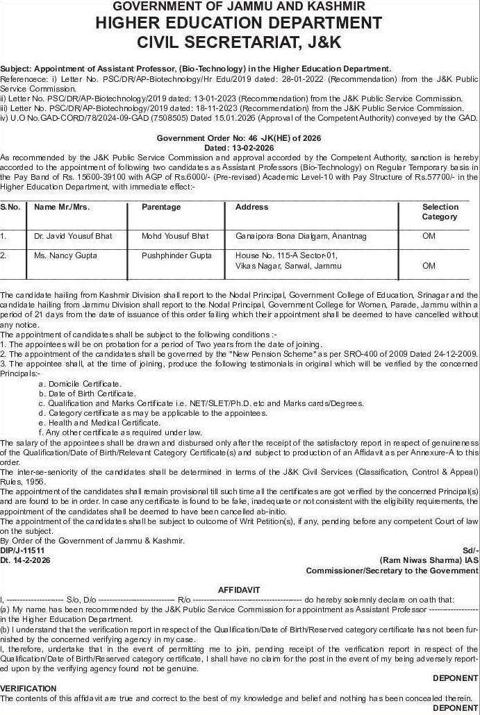 As recommended by the J&K Public Service Commission and approval accorded by the Competent Authority, sanction is hereby accorded to the appointment of following two candidates as Assistant Professors (Bio-Technology) on Regular Temporary basis in the Pay Band of Rs. 15600-39100 with AGP of Rs.6000/- (Pre-revised) Academic Level-10 with Pay Structure of Rs.57700/- in the Higher Education Department, with immediate effect:-