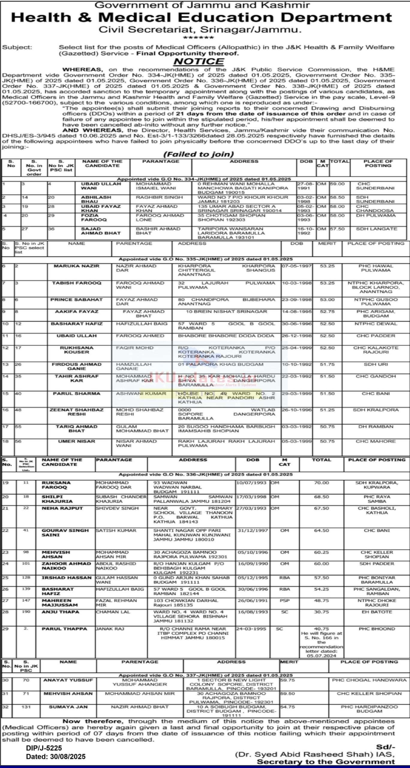 WHEREAS, on the recommendations of the J&K Public Service Commission, the H&ME Department vide Government Order No. 334-JK(HME) of 2025 dated 01.05.2025, Government Order No. 335-JK(HME) of 2025 dated 01.05.2025, Government Order No. 336-JK(HME) of 2025 dated 01.05.2025, Government Order No. 337-JK(HME) of 2025 dated 01.05.2025 and Government Order No. 338-JK(HME) of 2025 dated 01.05.2025, has accorded sanction to the temporary appointment along with posting of various candidates, as Medical Officers in the Jammu and Kashmir Health and Family Welfare (Gazetted) Service in the pay scale, Level-9 (52700-166700), subject to usual conditions, with the stipulation to report to their places of posting within 21 days from the date of issuance of these orders in case of Direct Recruits (DRDs) only.