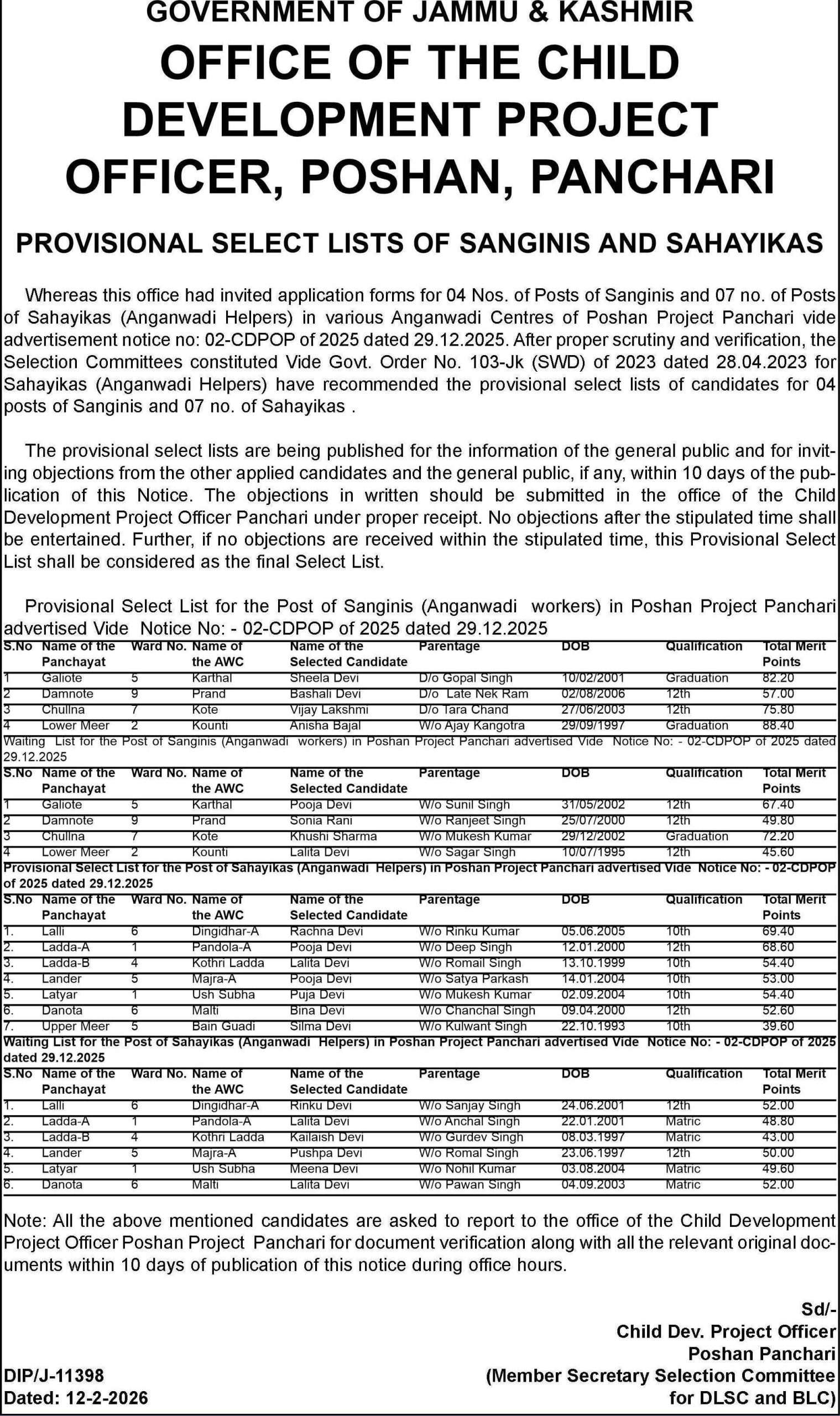 Whereas this office had invited application forms for 04 posts of Sanginis and 07 posts of Sahayikas (Anganwadi Helpers) in various Anganwadi Centres of Poshan Project Panchari vide Advertisement Notice No. 02-CDPOP of 2025 dated 29.12.2025.
