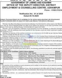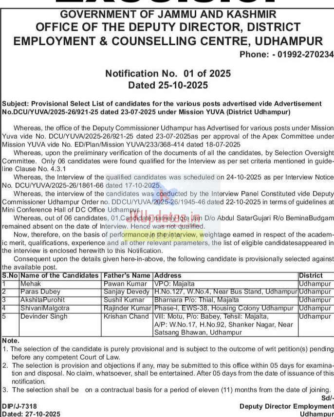 Whereas, the office of the Deputy Commissioner Udhampur has Advertised for various posts under Mission Yuva vide No. DCU/YUVA/2025-26/921-25 dated 23-07-2025as per approval of the Apex Committee under Mission YUVA vide No. ED/Plan/Mission YUVA/233/368-414 dated 18-07-2025
