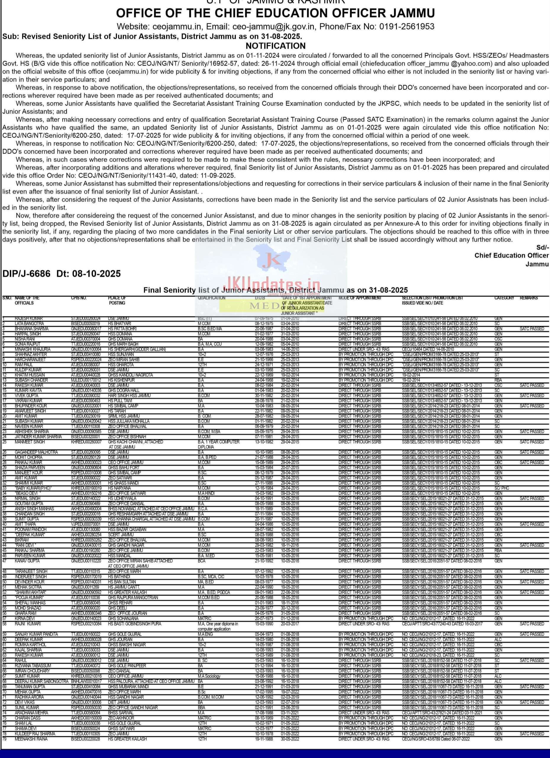 Whereas, the said Seniority list of Junior Assistants, District Jammu as on 01-01-2025 has been finalized vide this office notification No: CEOJ/NG/NT/Seniority/21143-49, dated: 19-09-2025; and