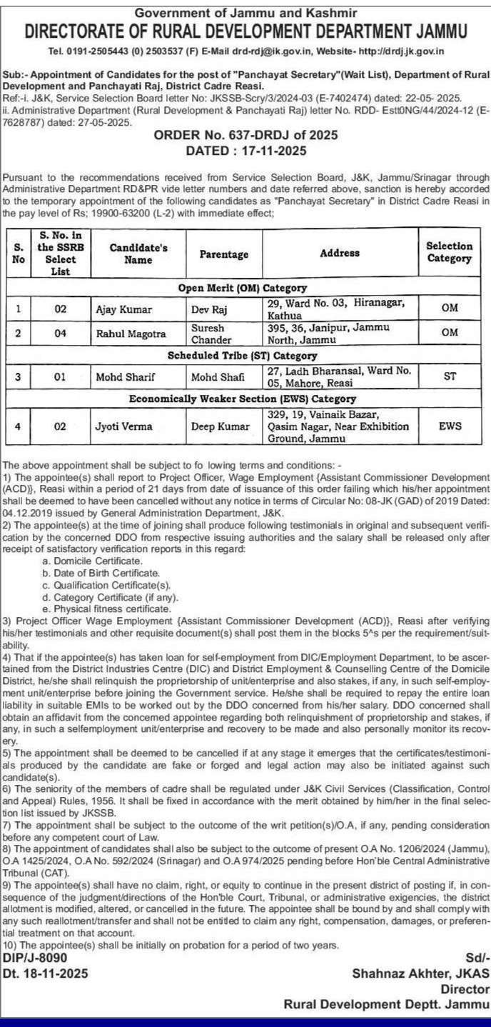 Appointment of Candidates for the post of “Panchayat Secretary”(Wait List), Department of Rural Development and Panchayati Raj, District Cadre Reasi.