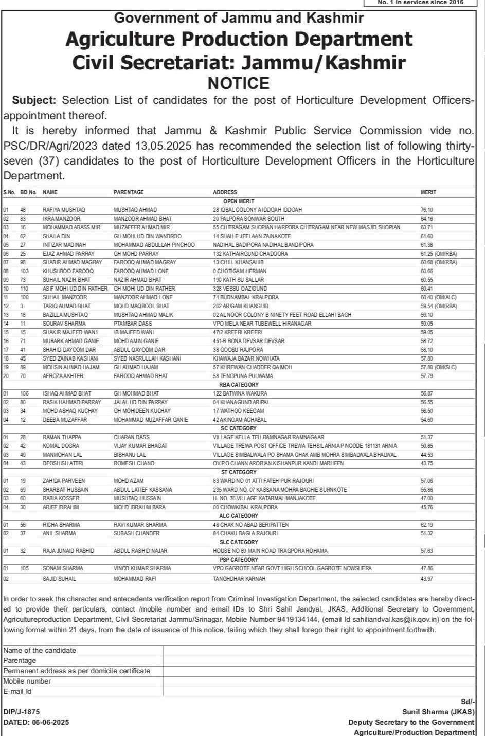 It is hereby informed that Jammu & Kashmir Public Service Commission vide no. PSC/DR/Agri/2023 dated 13.05.2025 has recommended the selection list of following thirty-seven (37) candidates to the post of Horticulture Development Officers in the Horticulture Department.