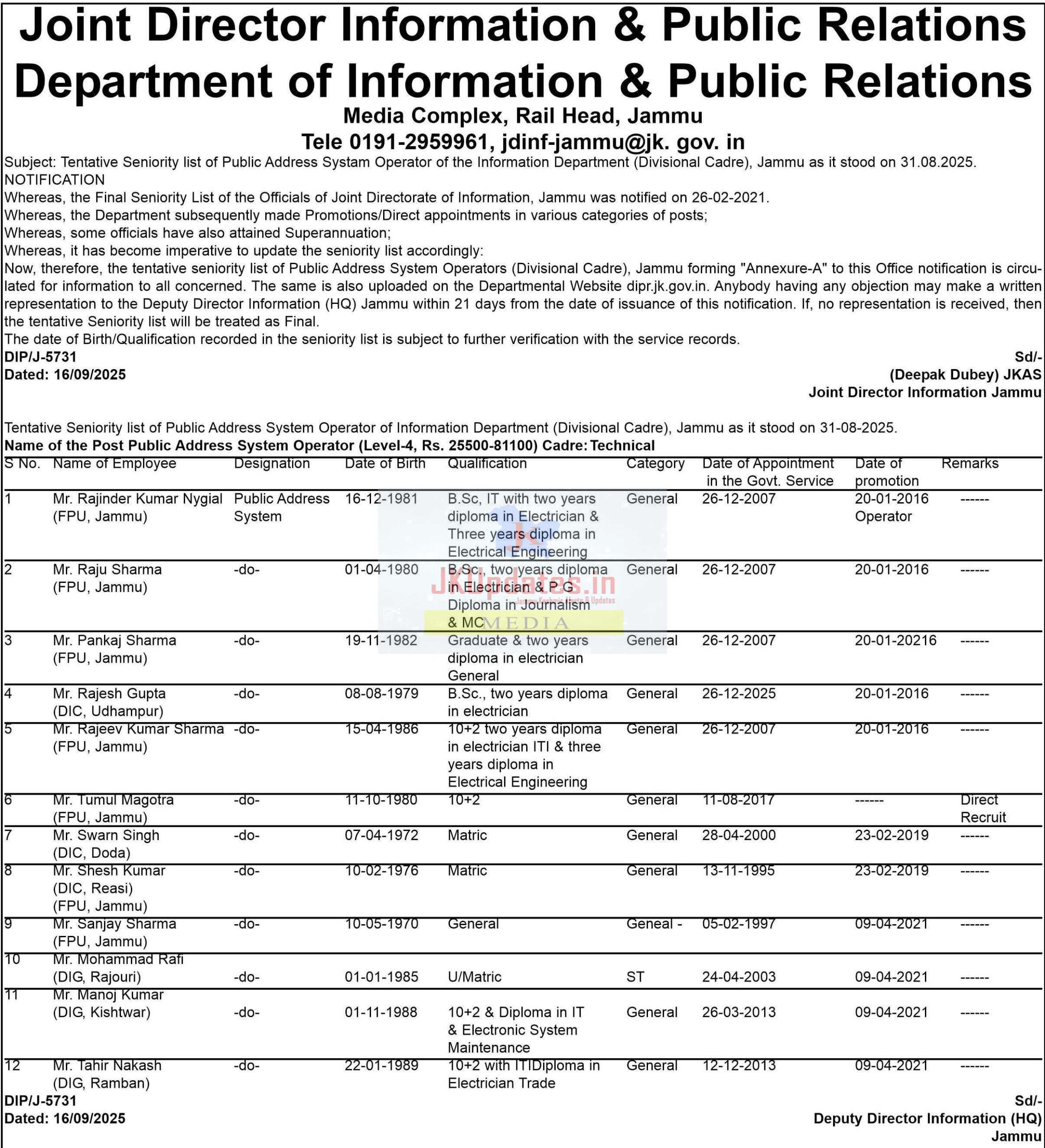 Tentative Seniority list of Public Address System Operator of the Information Department (Divisional Cadre), Jammu as it stood on 31.08.2025.