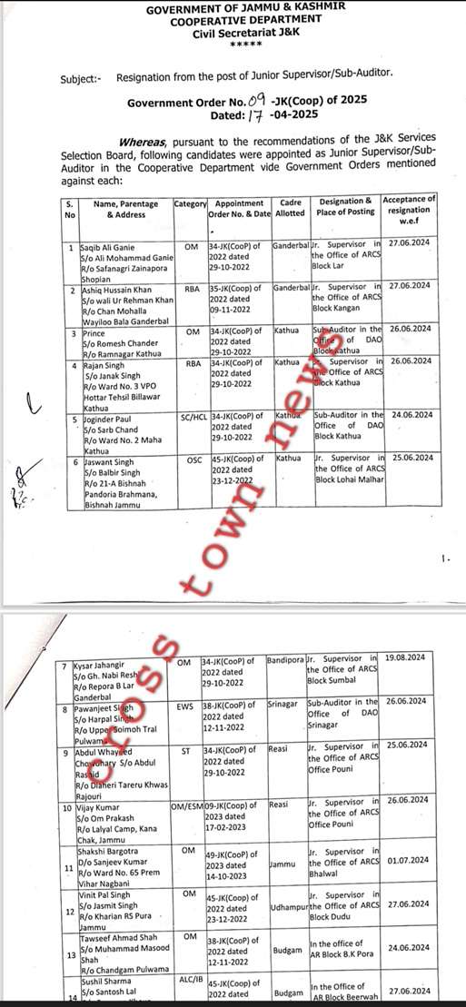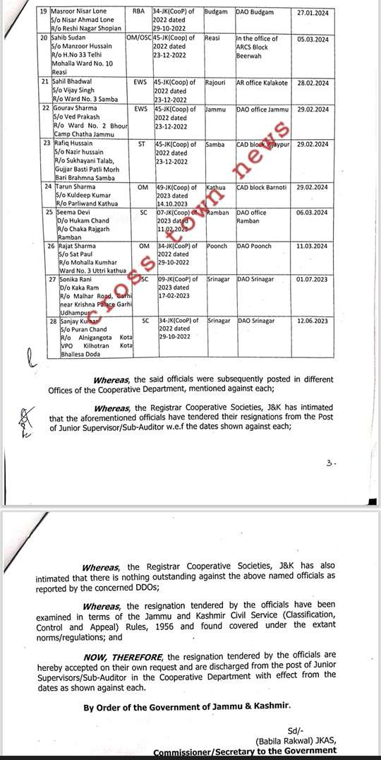 28 Govt Officials resigned from Govt services, J&K Govt accepted, order copy with CTN reads as under:-