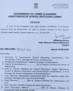 In view of the inclement and bad weather conditions, it is hereby ordered that all Government as well as Private schools in the Jammu Division shall remain closed tomorrow, i.e., 25.08.2025.