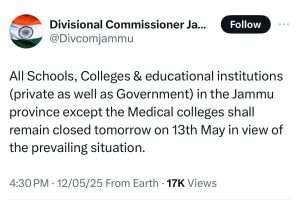 All Schools, Colleges & educational institutions (private as well as Government) in the Jammu province except the Medical colleges shall remain closed tomorrow on 13th May in view of the prevailing situation.
