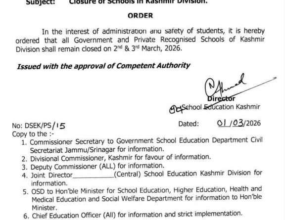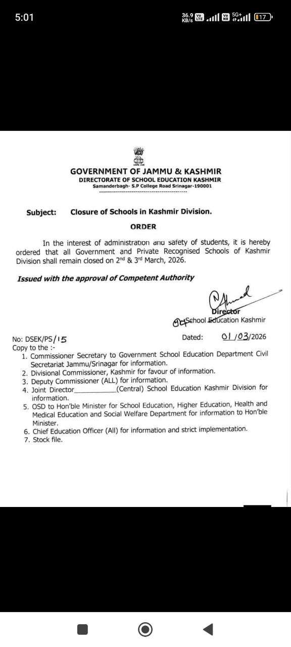 Mar 1, 2026 JKUpdates All schools, colleges to remain closed in Kashmir for 2 Days : Education minister Sakina Itoo On 2nd and 3rd March 2026 Join JK Updates WhatsApp Channel Install our App & get daily FREE Mock Test 5L+ App Installs - Trusted by Lakhs of Users - Install--> Android - IOS 👉Join Our Telegram Channel JK News TodayKashmir News