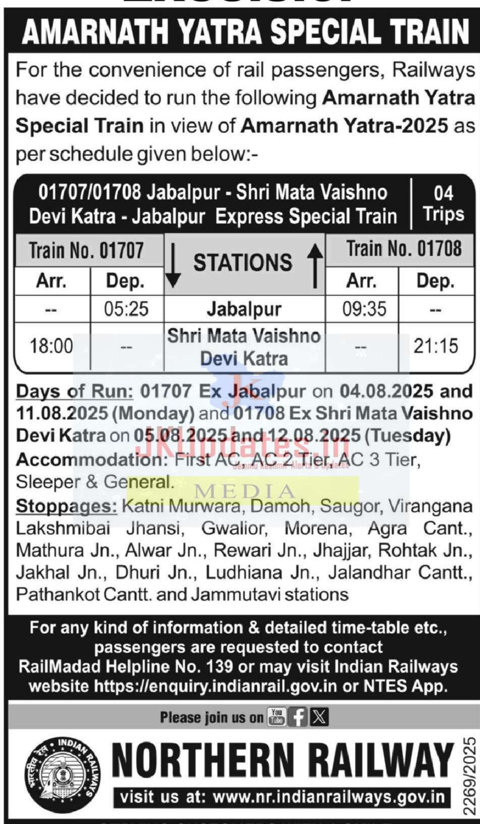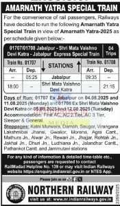 For the convenience of rail passengers, Railways have decided to run the following Amarnath Yatra Special Train in view of Amarnath Yatra–2025 as per schedule given below:–
